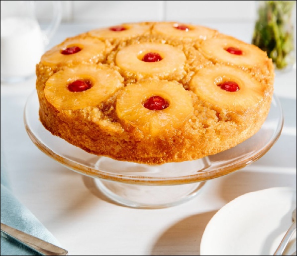In another small bowl, beat egg whites until stiff peaks form; fold into batter. Pour batter into prepared pan, covering pineapple slices and cherries.